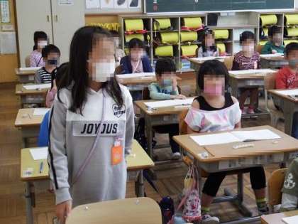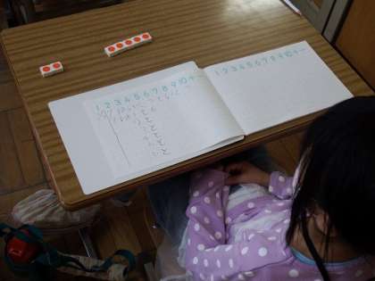今日の算数の授業は、7の分解です。7はいくつといくつの分けられるか。数図ブロックで確かめながら、いろんなパターンを考えていきます。1と6、2と5,3と4,4と3,5と2,6と1。ノートの取り方も、あわせて勉強しています。