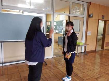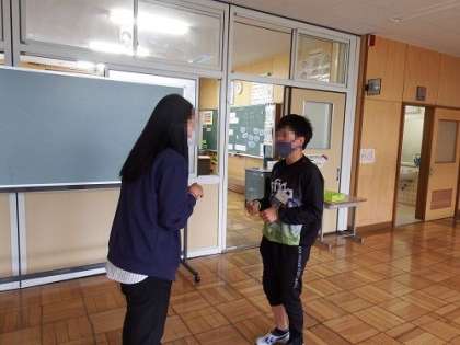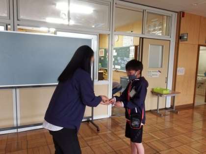 5年生の英語の授業です。今日の課題は、ALTの先生に自己紹介をすることでした。一対一で自己紹介を行ったので、少し緊張する子も。身振り手振りも使いながら、好きな色や好きな食べ物、スポーツなど一生懸命に伝えていました。とても、よい経験になったと思います。