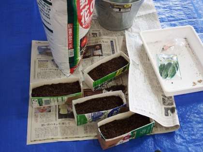 4年生の各教室の後ろには、牛乳パックでつくったポットがあり、ツルレイシの種が植えてあります。これから夏に向けて、ぐんぐん伸びていくはずです。成長の様子を観察するのがとても楽しみです。