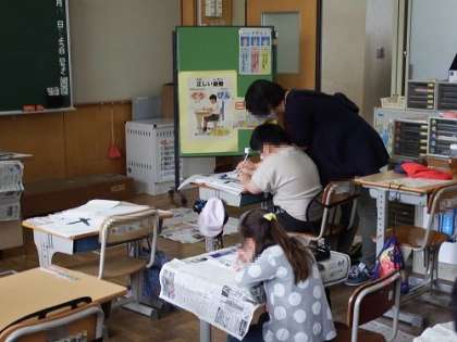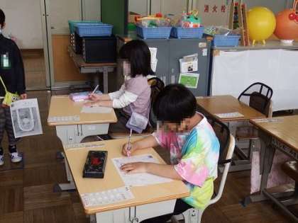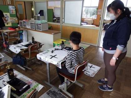 写真は、書写の時間の様子です。3・4年生は、「十」という漢字を毛筆で書きました。縦の線と横の線の筆遣いに注意しながら、集中して取り組んでいました。1・2年生は硬筆です。書くときの姿勢や鉛筆の正しい持ち方を学習していました。
