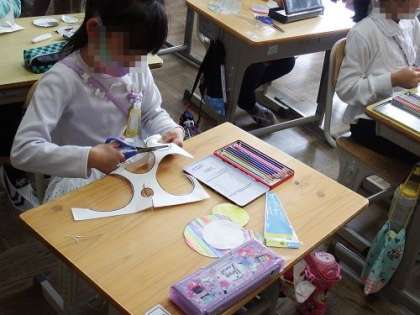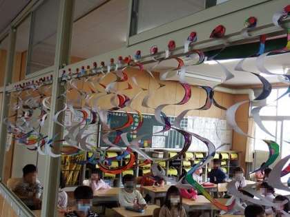 1年生は、図工で「ぐるぐるへび」の制作を行いました。色や模様をつけた円にそってきることで、ぐるぐる巻きのへびができあがります。とてもカラフルな個性的なへびができあがりました。掲示されている作品が、かぜに吹かれて動くところがおもしろいです。