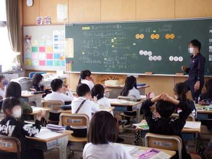 3年生の算数の授業の様子です。この日は、「答えが10より大きい数のわり算」について学習を進めました。最初に、十の位の数字を割って、次に一の位の数を割ります。お金の模型を使いながら、一つずつ解決していました。