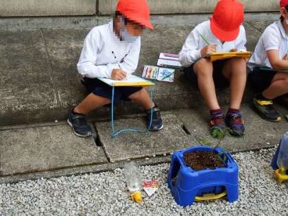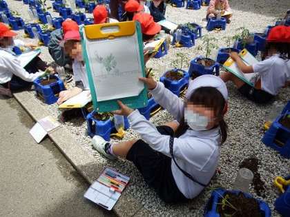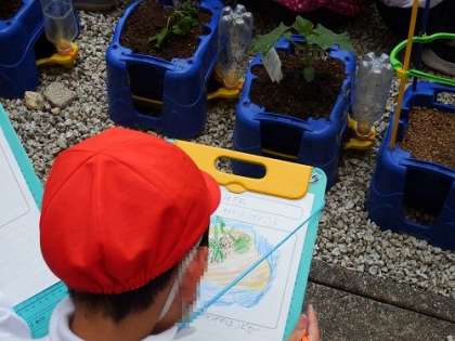 2年生が植えた野菜がすくすくと育っています。登校後に自分の野菜の様子を見にくる子もたくさん。観察記録をとるのも、とてもうれしそうです。「こんなにおおきくなったんだよ」と自分の鉢を見せてくれる顔も笑顔です。
