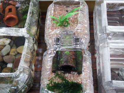 先日、美山小学校にやってきたメダカたち。子どもたちのペットボトル水槽の中で元気に泳いでいます。5年生の各教室の前は、ペットボトルが並び、美山アクアリウムになっています。