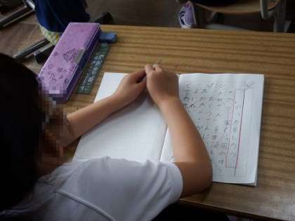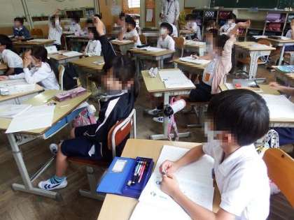国語で作文の授業を行っています。今日は、「 」のつけ方を学習しました。「」は一マス使うこと、マス目のどこに書くか、2行にわたる場合は2行目は一マスあけることなどの約束事を知りました。