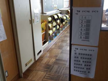 算数で「いくつといくつにわかれるか」の学習を進めています。楽しみながら問題に慣れるなめに、タンブリンを使って節をつくったり、教室の入り口に問題をはったり・・・。たくさんの触れる機会を通して、吸収してくれることを願っています。