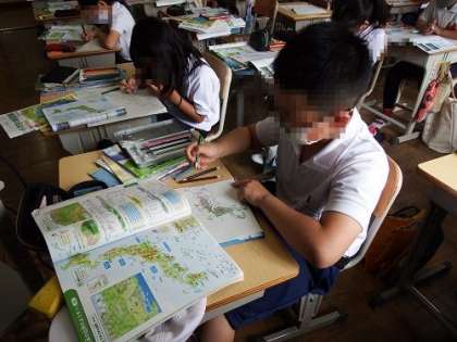 5年生の社会科で、国土の地形のまとめの学習に入りました。各自で、日本の地形を白地図にまとめます。地図で調べながら、色をぬったり、地名を書き込んだり。時間がきたので途中できりあげようとすると「ちょっと待って」という声があちこちからあがり、みんな作成に集中しているようでした。
