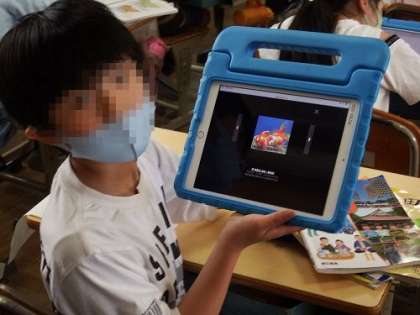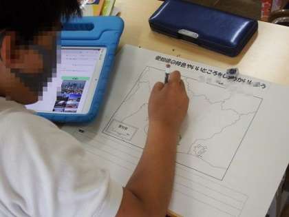 4年生では愛知県の学習を進めています。この日は、「愛知県の特色やいいところをしょうかいする」という課題のもと、調べ学習に入りました。タブレットを使って、自分が気になっていることを調べていきます。白地図がどんなふうになるのか、楽しみです。