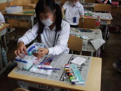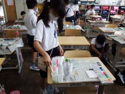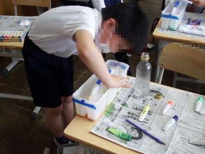 「半紙でそめ紙をしてあそぼう」に取り組みました。水彩絵の具を使って色水を作ります。それぞれの色を半紙に吸わせて作品ができあがります。思いもかけない模様ができ、とても楽しそうでした。