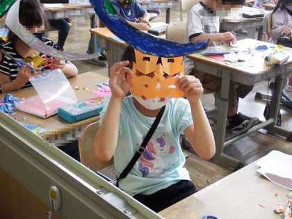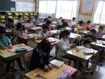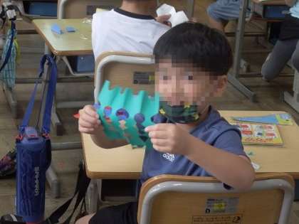 1年生の図工で「ちょきちょきかざり」の学習に取り組みました。色紙を折ってハナミを入れると、思ってもみない様々な切込みがはいります。自分の作った飾りを自慢する子が続出。楽しい時間になったようです。