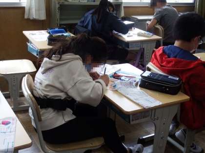 5年生の家庭科の授業。「一針に心をこめて」ボタンの縫い付けをしました。以前に学習した玉結びを活用しながら。針先を見つめる顔は、真剣そのものです。上手にボタンを縫い付けることができました。