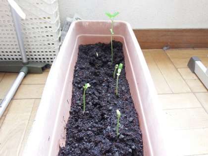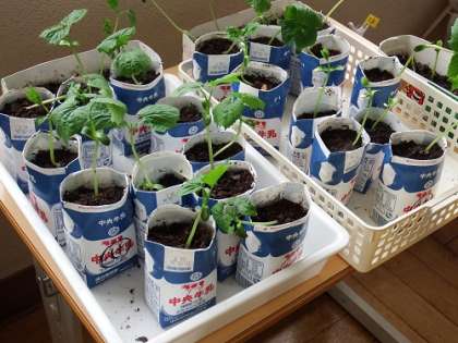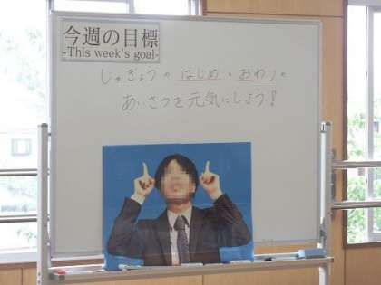 4年生の教室や広場では、夏に向けてツルレイシが成長してきました。また、広場には、先生の写真を使って、今週の目標の掲示もあります。