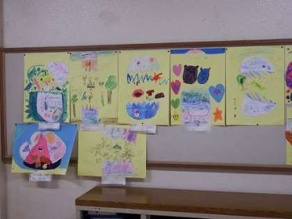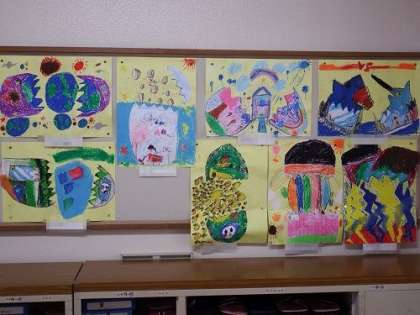 2年生が図工で取り組んできた「ふしぎなたまご」が完成しました。どの子の作品も、夢にあふれています。写真は、2年1組と2組の学年掲示板に紹介されている作品です。