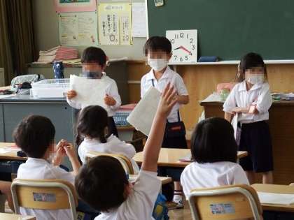 国語の「みんなにはなそう」の単元でクイズ大会を行いました。ヒントが含まれた話型のプリントを使って、自分が考えた問題をみんなに出題します。声の大きさに気をつけて、みんなの顔を見て話すように心がけていました。それにこたえるように、たくさんの手があがっていました。