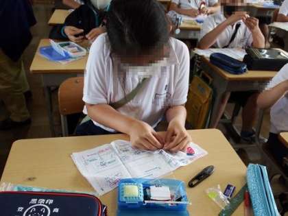 5年生の家庭科でボタン付けが進んできました。今日は、4つ穴のボタン付けに挑戦です。これでできるようになったら、自分の服のボタンもスイスイ付けられるでしょうか。