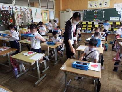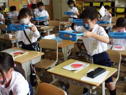 1年生もタブレットを使い始めています。まず、立ち上げの仕方、操作の基本、安全な使い方などから学習を進めています。写真は、1年2組で、カメラ機能を使っている様子です。