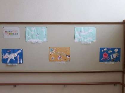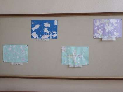 4年生の図工「絵のぐでゆめもよう」の作品が完成しました。子どもたちが考えた海の中の世界や宇宙、夢の国などを絵のぐを使った貼り絵で表現します。子どもたちらしい発想豊かな世界が広がります。写真は、学年掲示板に貼られている4年1組と2組の子の絵です。