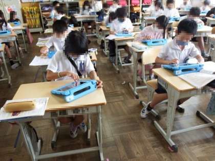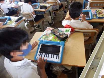 写真は、3年生の音楽の授業の様子です。今日は、タブレットのピアノの機能を使いながら、指の動かし方のテストを行っていました。テストの前には、みんな練習に集中です。