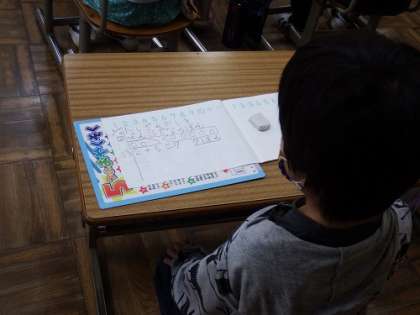 1年生の算数「たしざん」の授業の一コマです。今日は、たし算の立式の仕方や読み方を学習しました。2+5=7、2たす5は7 繰り返し読み上げながら定着を目指していきます。