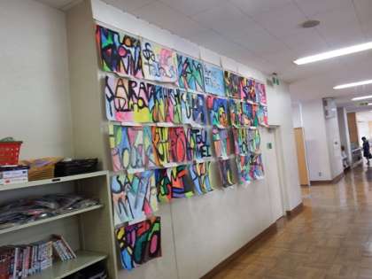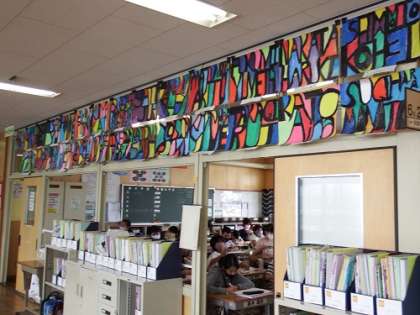6年生の図工「名前でアート」で制作した作品が、教室や広場などに掲示されています。自分の名前を使ったデザイン画です。色とりどりでとてもきれいです。