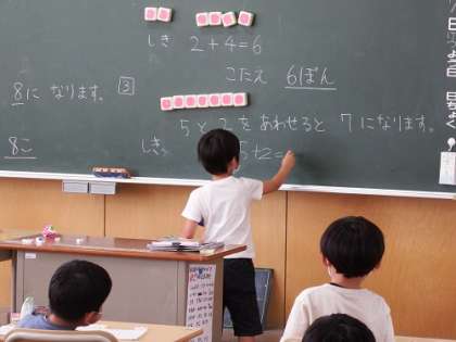1年生の算数「たしざん」では、たし算の立式の学習を進めています。書き方や読み方を含め、練習を繰り返しながら少しずつ慣れてきました。自分で立式できる子も増えてきています。