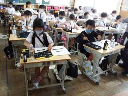 今日は、書写の時間に漢字の「二」に取り組みました。「ニ」の字を使って、横棒をどのように書くかの練習です。書写の時間の準備や片付けも段々手際よくできるようになってきました。
