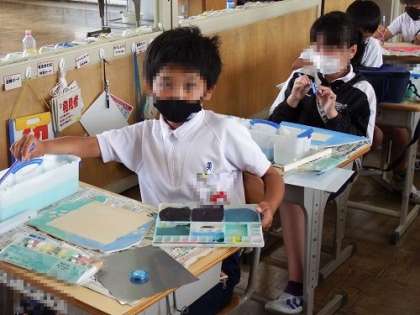 5年生の図工「ホワイトボード」の製作が進んできました。切り取る作業が終わり、この日は、色つけを行いました。動物など、頭の中にイメージしたものに合わせ、一生懸命に塗っていました。完成が待ち遠しいですね。
