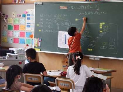 算数の授業で、「一万をこえる数」の学習を行っています。ケタをそろえて、どのように読んだり書いたりするのか、数字から漢字にしたり、漢字から数字にしたりしながら、一万をこえる数字の概念をつかんでいきます。