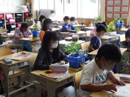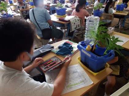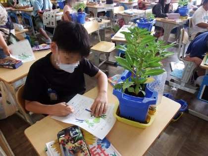 理科の学習で育てているホウセンカがぐんぐん成長し、こんなに大きくなりました。観察記録をかく手にも力が入ります。太くなった茎からたくさんの葉をかき、緑で色塗りをします。観察は、この後も続きます。