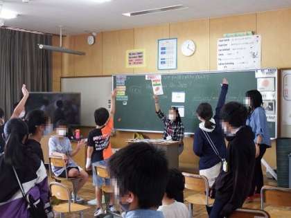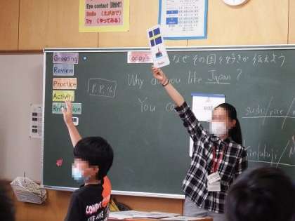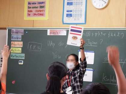 「Why〜」を使って、「なぜ、その国が好きか伝えよう」の学習に取り組みました。まずは、国旗から国名をあてるクイズです。元気な声が聞こえ、盛り上がる中で授業が進んでいきました。