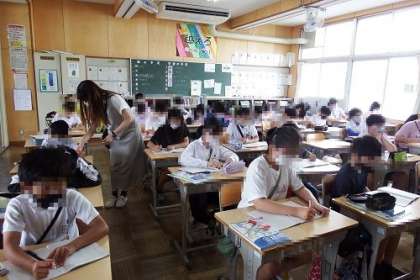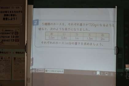写真は、5年生の算数で「小数のわり算」の学習を行っている様子です。一つの問題にも、いろいろな解き方が発表されました。この問題を解いて・・・。