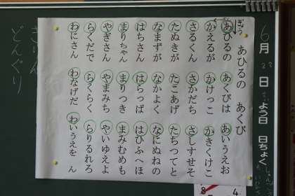 1年生の国語で、ひらがな50音の学習に取り組みました。歌を使って覚えたり、手拍子でリズムをとったりしながら、練習します。まずは、自分が好きな行から順番に覚えていきました。