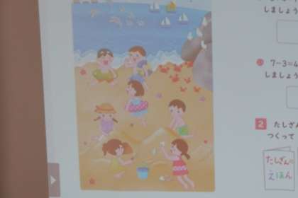 1年生の算数で「えをみて、たしざんやひきざんのおはなしをつくろう」に挑戦しました。問題作りは初めての体験です。最初は、ハードルが高かった子どもたちですが、少しずつ慣れ、問題作りを進めました。
