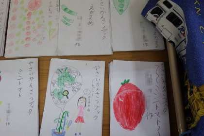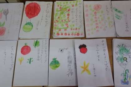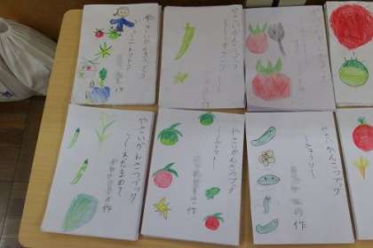 2年生が育てている野菜の観察ブックができあがってきました。表紙に絵が描かれ、中にも野菜についての情報や観察して絵が描かれています。子どもたちの思いがいっぱいつまった観察ブックになりました。
