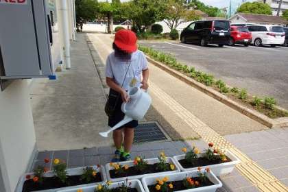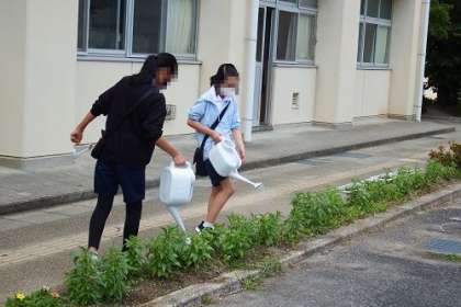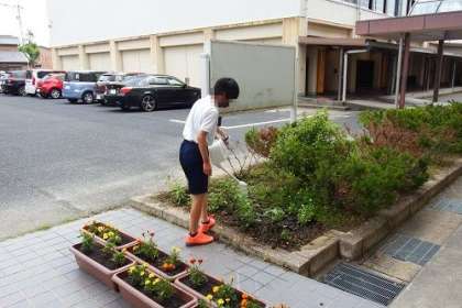 6年生の栽培委員会の子が、玄関や職員室前の花壇の水やりをしてくれています。暑い日になることもあり、こうしてお世話をしてくれることで、コスモスなどの花が生き生きと育っています。ありがとうございます。