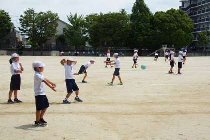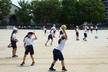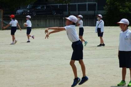 写真は、4年生の体育「投運動」の様子です。大きめのボールを使って、様々な投げ方に挑戦していました。遠くに投げるために必要な体の動きを身に付けてほしいです。