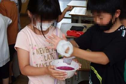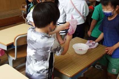 1年生が育てているアサガオの花を使って「いろみずあそび」を行いました。アサガオの花を色水につけて汁を絞り出します。紫色の染まった色を使って、紙に色をつけました。自分たちが作った色水をもち、とても嬉しそうでした。