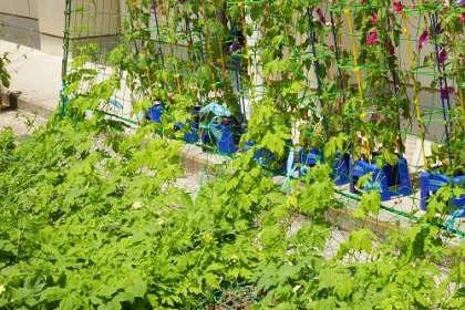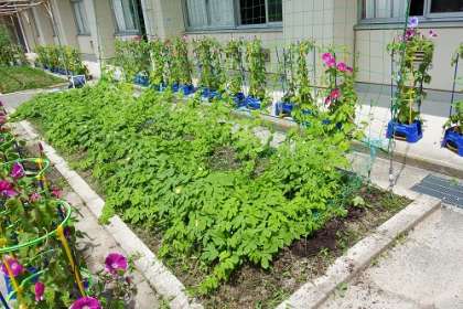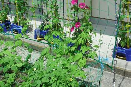 中庭に設置された緑のカーテンのネットに、ツルレイシのつたが伸びてきました。夏が近づくにつれ、日に日に成長しているように感じます。カーテンが緑いっぱいになって、日差しをさえぎってくれる日が待ち遠しいです。