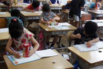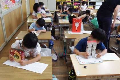 1年生がもってきたたくさんの箱を使っての学習が始まりました。「はこのようなかたち」「つつのようなかたち」「ぼおるみたいなかたち」を確認したあと、自分のノートにもってきた箱の形を写しました。