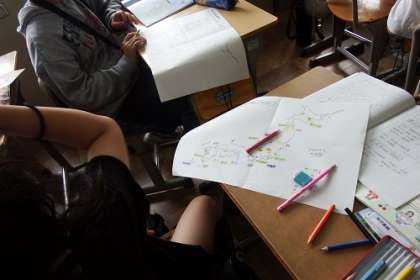 「わたしたちが食べている食べ物の産地をまとめよう」で、タブレットなどを使って調べたことを白地図に書き込みながら、まとめを作成しています。食べ物の絵を上手に取り入れたり、色を塗り分けたりしながら、見やすくなるように工夫しています。