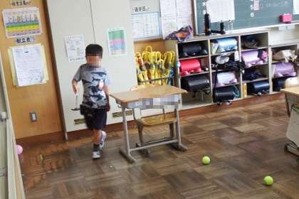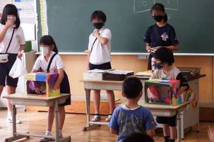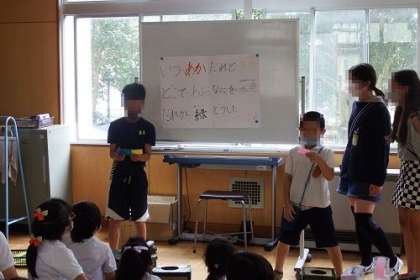 なかよし集会の様子の続きです。写真は、「箱のなかみあてゲーム」「いつ、どこで、だれかゲーム」「お玉でリレー」です。