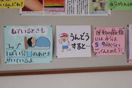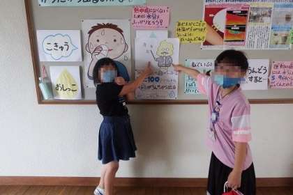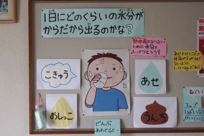 保健室横の掲示板が変わっています。今月は、熱中症予防を考えて、「1日にどれだけの水分が体から出るかな」です。クイズ形式になっているので、子どもたちは友達同士で楽しみながら学んでいます。