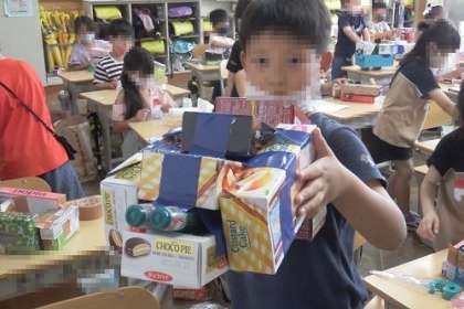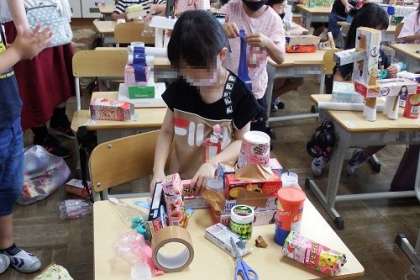 箱を使ってこんなに素敵な作品ができました。馬やウサギ、戦車まで、夢いっぱいの作品です。