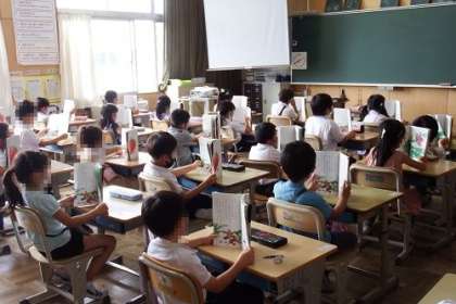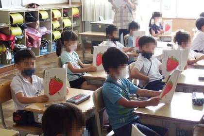 1年生の国語で本読みをしています。両手で本を持ちながら読んでいるので、前から見るといちご畑のようです。姿勢よく本を読む基本を身に付けます。
