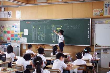 3年生算数の「ぼうグラフ」の授業です。2つのぼうグラフを比較して、その良さを考えます。見やすくするためにどう並べるのか、メモリはどうするのか、グラフ作成の基礎を学びます。