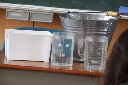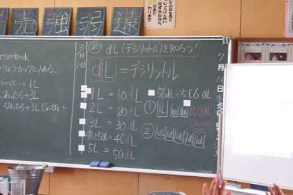 2年生の算数で「デシリットル」の学習を行いました。「1リットルは10デシリットル」を使って、リットルとデシリットルの変換も実施しました。量を実感するために、実際のマスに水を入れて行ってみました。