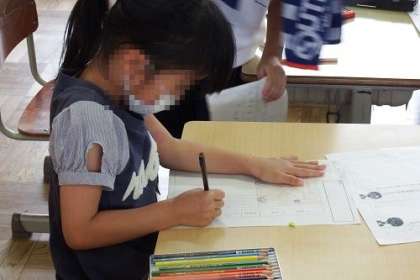 国語「えにっきをかこう」の学習の様子です。自分の気持ちや様子を入れて書くことが条件です。どんなことを書いたら、読み手に様子がよく伝わるのか、一生懸命に考え、書いていました。