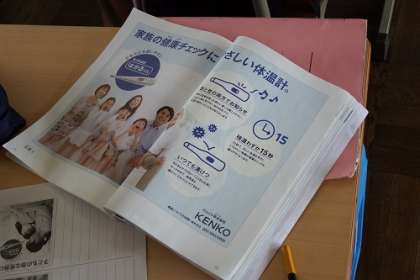 国語で「広告で伝えたいことやその目的を考える」授業を行いました。体温計の広告を例に、見出しや背景、写真などの入れ方について考えました。相手に伝えるための工夫について気がついたようです。