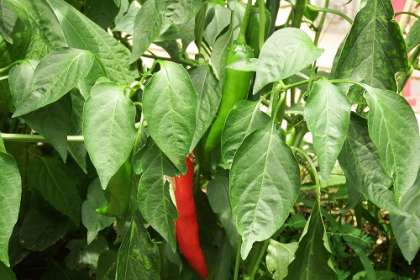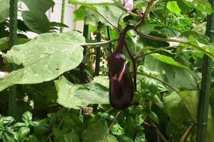 中庭の畑で野菜がすくすくと育っています。特に、トマト、とうがらし、なすなどが元気です。夏の暑さにも負けない野菜たちの強い生命力ですね。
