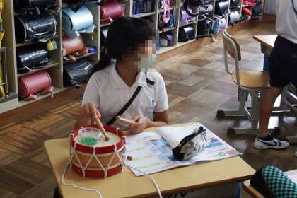 3年生の理科で「音のふしぎ」を学習しています。今日は、タイコやコップを使って、音が出るときは振動していることを、実験しました。ビーズなどが飛ぶことで、音は物をふるわせることを理解できました。